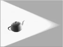 6. Выполните визуализацию окна проекций Perspective (Перспектива). В кадре те-перь отображается видимый конус света и чайник, расположенный внутри дан-ного конуса (рис. 9. 31). Таким образом, вы сделали лучи света видимыми в кадре визуализации, они похожи на светлый туман. Далее мы будем настраи-вать внешний вид лучей света, оперируя рядом параметров, расположенных в группах ниже: Volume (Объем), Attenuation (Спад), Noise ( Шум). Данные па-раметры позволяют редактировать объемный свет, влияя на основные его харак-теристики.