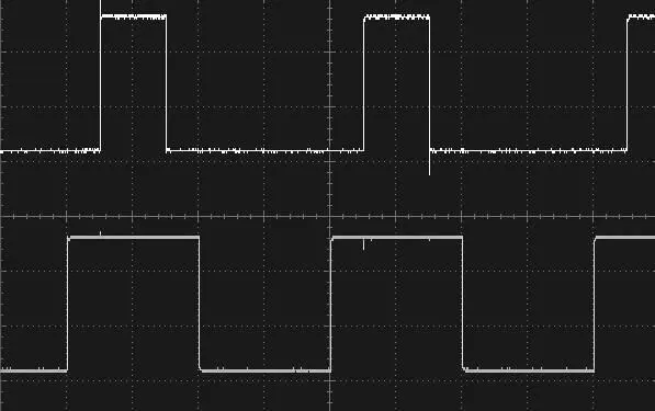 Ради интереса давайте посмотрим, до какой степени можно увеличить частоту сигнала PWM. Если уменьшить длительность периода до 10, частота сигнала PWM должна увеличиться до 100 кГц. Форма сигналов, полученных с этими параметрами, показана на рис. 3.4.