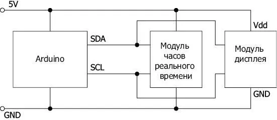 На рис. 7.2 изображена возможная схема подключения к плате Arduino двух компонентов I2C: часов реального времени и модуля дисплея.