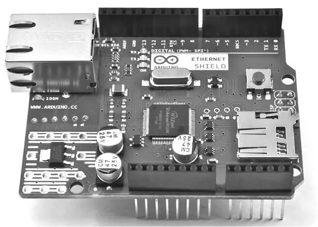 На официальных платах используется микросхема W5100, можно найти более дешевые платы расширения Ethernet на наборе микросхем ENC28J60. Но эти более дешевые платы не совместимы с библиотекой Ethernet, и лучше избегать их, если только вы не ограничены во времени или в средствах.