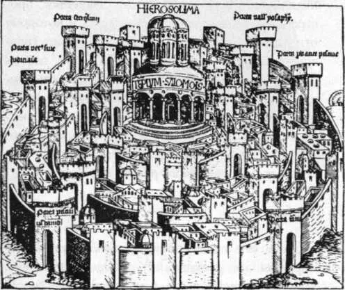 29. На средневековой гравюре изображен земной Иерусалим, несовершенное и бренное отражение Иерусалима небесного, созданного Богом одновременно с раем. В центре мы видим храм Соломона, окруженный несколькими рядами крепостных стен. Округлый город имеет форму спирали или лабиринта, задача которого как раз и состоит в том, чтобы охранять центр.