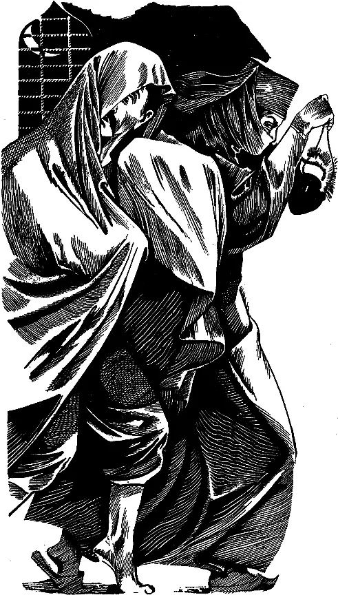 Недолго думая, набросил я на себя накидку. Голову она сама мне хорошенько укрыла. Сапожищи с ног моих стащила. Потом из двери выглянула, прислушалась и знаком мне за ней идти велит.