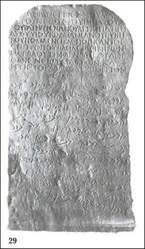 29. Камень-билингва из Армази с. эпитафией принцессе Серапите на греческом и среднеперсидском языках. Из погребения 4 в Армазис-Хеви. Середина II в. н. э. Размер 1,93x0,65 м.