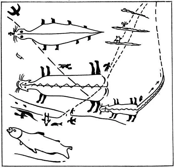 В соответствии с таким пониманием устройства мира, земные леса рассматривались как шерсть космического лося, животные — как паразиты на его теле, а птицы — как вьющиеся над ним комары. Уставая от длительной неподвижности, лось время от времени переступает с ноги на ногу, вызывая землетрясения. Но только этим картина вселенной в облике зверя не исчерпывается. Ниже лося, образующего своим телом землю, помещается еще один лось, в точности подобный первому. Это — нижний, загробный мир, во всем повторяющий мир живых, но с той лишь разницей, что там все наоборот. Орочи были наслышаны и о других краях, и это нашло отражение на описываемой картине, где западнее материка-лося изображен еще один континент в виде фантастического дракона с жалом, усами, на восьми ногах и с горным хребтом на спине. По определению старика-ороча, рисовавшего карту, это — "однако, Америка". К востоку от родины орочей располагается хорошо знакомый им остров Сахалин, которому также придан облик животного, на этот раз — большого лосося, раскрашенного наполовину в синий, наполовину в красный цвет [55] Аврорин В. А., Козьминский И. И. Представления орочей о вселенной, о переселении душ и путешествиях шаманов, изображенные на "карте"/Сборник Музея антропологии и этнографии. — М. — Л., 1949. — Вып. П. — С. 326-328.
