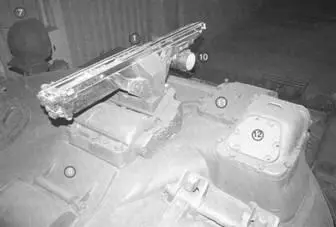 1 – пусковая установка; 2 – крышка окна дневного прицела; 3 – крышка окна ночного прицела; 4 – бронированная плита антенного устройства радиокомандной линии; 5 – отбойник газовой струи стартового двигателя ракеты; 6 – крышка командирского прибора наблюдения; 7- ИК-прожектор для ночного прицела; 8 – откидная часть крышки люка выдачи ПУ (чтобы не обрубить хвостовое оперение ракеты); 9 – открываемый люк для выдачи в стабилизированное положение ракеты (вместе с ПУ); 10- датчик поперечной составляющей ветра (для коррекции встреливания в зону захвата); 11 – крышка бронеколпака головки дневного прицела; 12 – крышка бронеколпака головки ночного прицела; 73 – люк командира; 14 – люк наводчика-оператора; 15 – лючок для установки трубы для преодоления водных преград; 16 – вырез в башне для пулемета ПКТ.