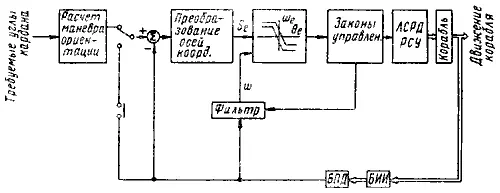 На рис. 32.5 представлена блок-схема одного канала ЦАП. Для простоты считалось, что команда по угловой скорости ?с уже преобразована к координатам, связанным с аппаратом. Роль ЦАП в этом случае заключается в выполнении динамических фильтрующих операций по выбору ошибок ориентации е требуемых для выработки команд сервомотору кардана и осуществления управления по этим командам.